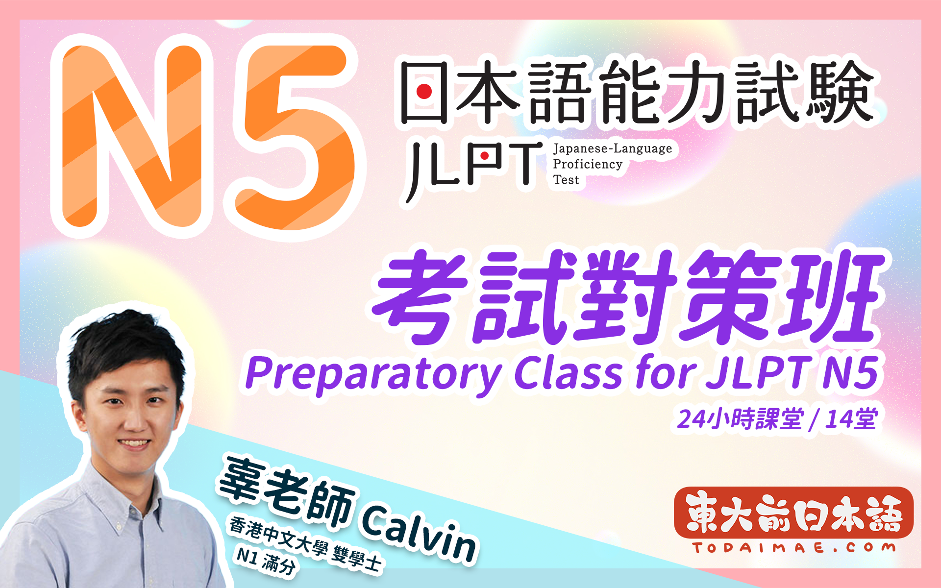 報名參加了 JLPT N5 考試但又尚未開始複習?不用擔心!東大前現推出了 JLPT N5 考前對策課程,總計約 24 小時,由本校的 Calvin 老師以廣東話及日語帶大家重點學習 JLPT N5 所涵蓋的文型,集中並清晰地講解不同文型之間的差異。除此之外,更會和同學們解說過去試題中容易犯錯的 N5 題型及文法,讓大家在半年內內充份備戰好能力試驗!