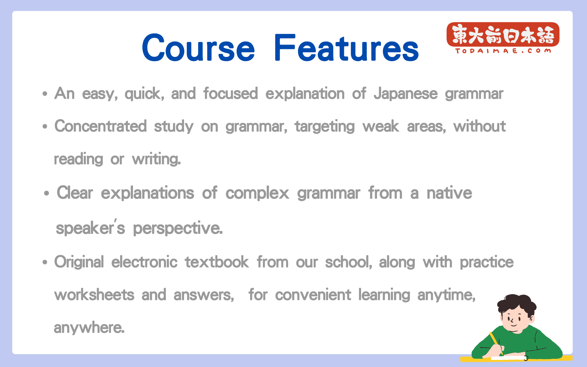 - 以地道日本人的角度,深入淺出地說明各種複雜的文法 Clear explanations of complex grammar from a native speaker's perspective.