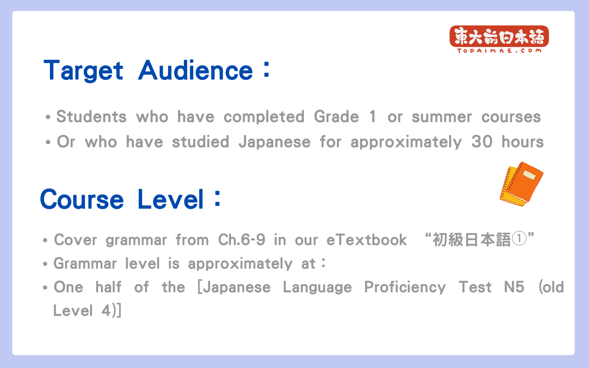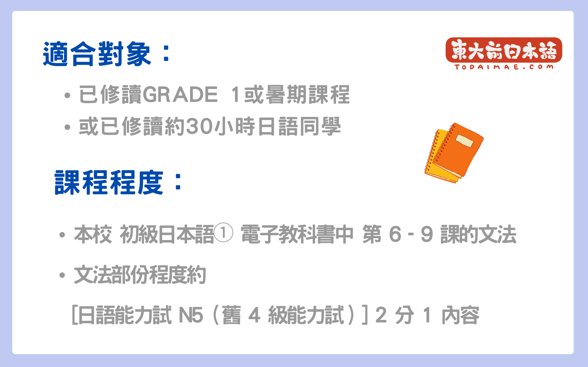 - 文法部份程度約[日語能力試 N5(舊 4 級能力試)] 2 分 1 內容