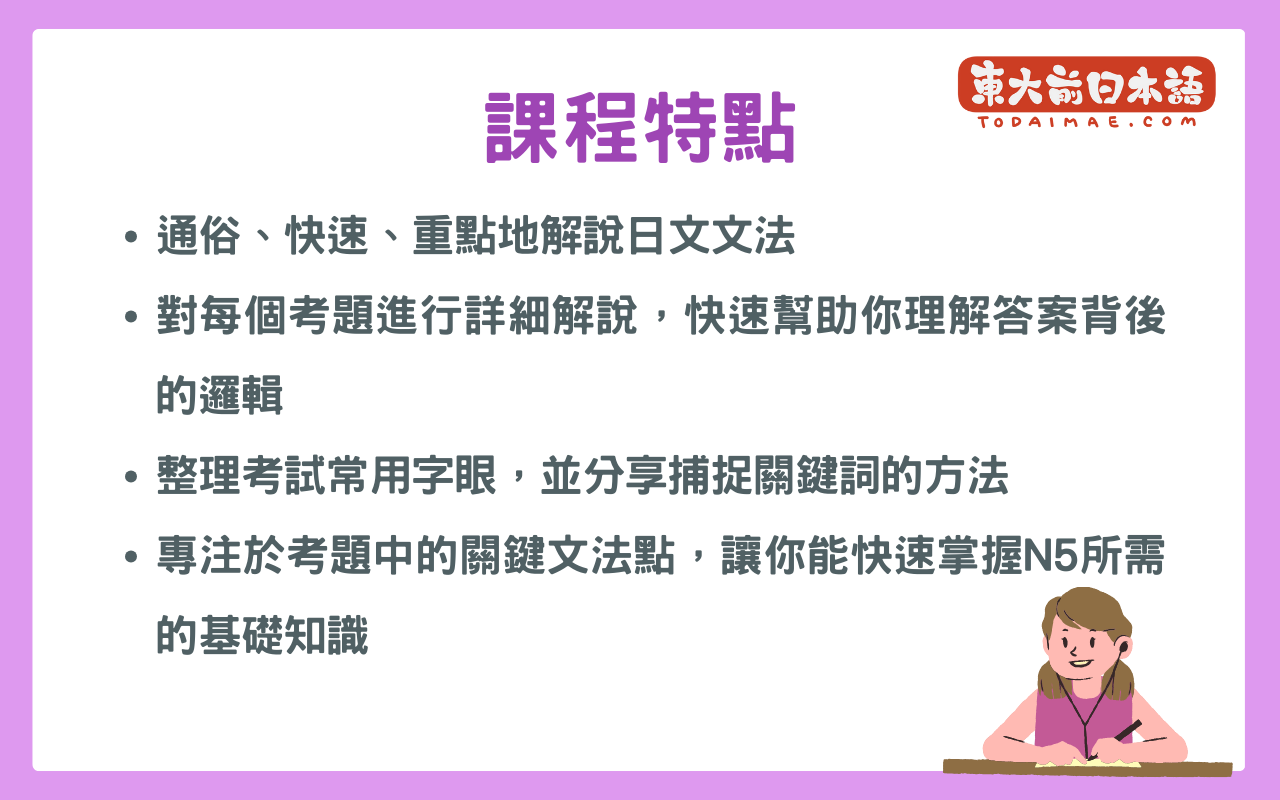 專注於考題中的關鍵文法點,讓你能快速掌握N5所需的基礎知識。