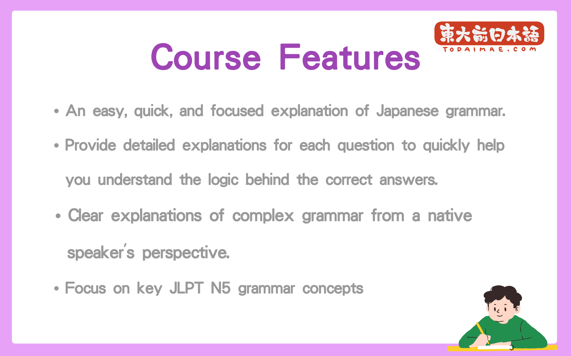 自學過日文但從未體驗過JLPT考試形式的文法問題?明明學過相關的文法,卻在做題時不知道如何作答?希望老師能在短時間內分析問題和答案?那麼我們的JLPT N5過去考題解答影片課程正是為你量身打造!本課程由專業的日語教師——友善老師,將以生動的英語和日語逐題解析過去考題的答案和相關文法,幫助你快速學習日文語法。