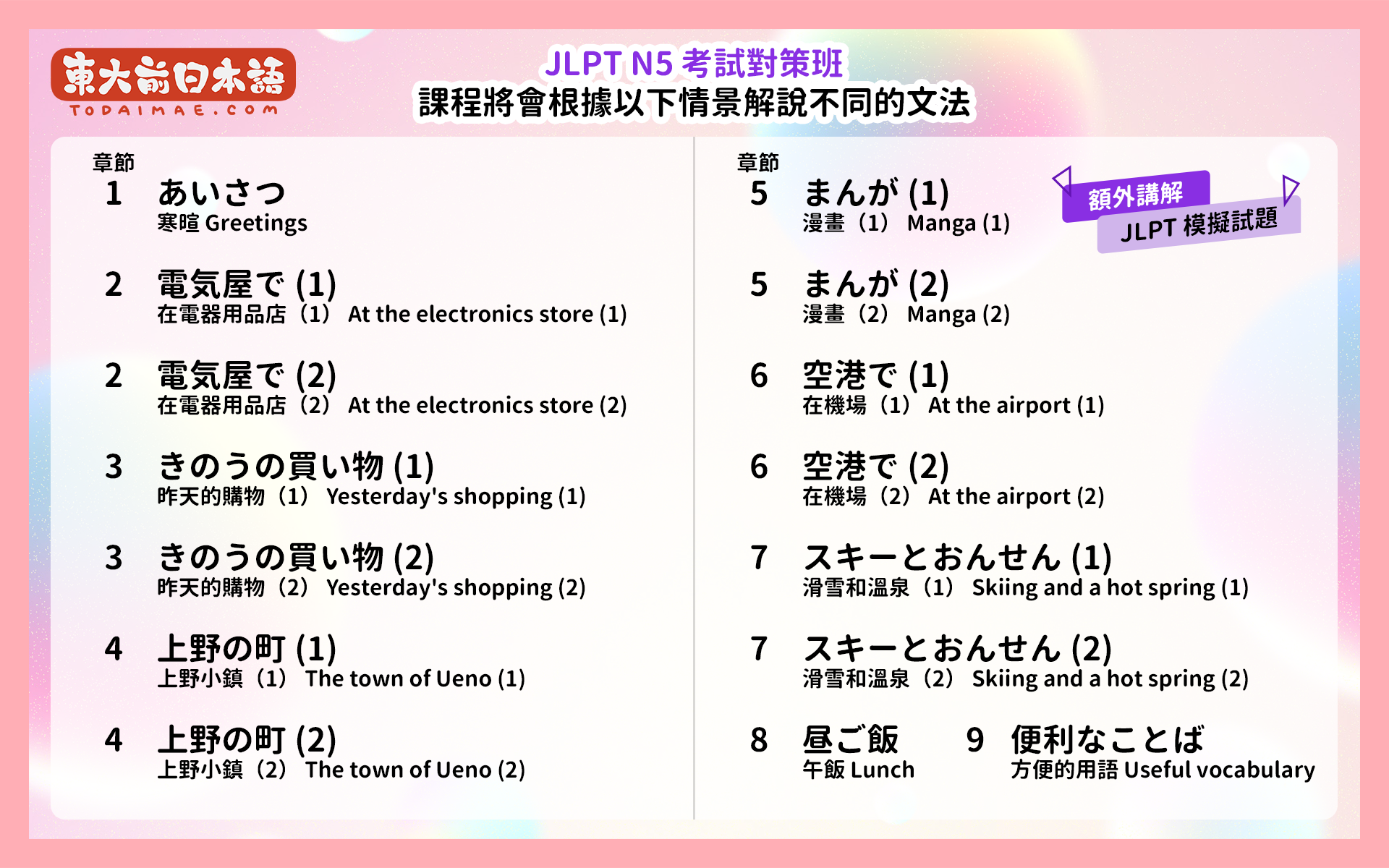 報名參加了 JLPT N5 考試但又尚未開始複習?不用擔心!東大前現推出了 JLPT N5 考前對策課程,總計約 24 小時,由本校的 Calvin 老師以廣東話及日語帶大家重點學習 JLPT N5 所涵蓋的文型,集中並清晰地講解不同文型之間的差異。除此之外,更會和同學們解說過去試題中容易犯錯的 N5 題型及文法,讓大家在半年內內充份備戰好能力試驗!